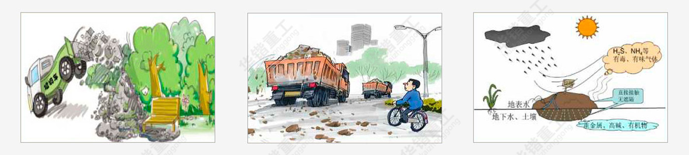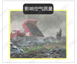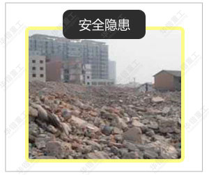 大多数城市建筑垃圾堆放地的选址在很大程度上具有随意性,留下不少安全隐患。在外界因素的影响下,堆出现崩塌,阻碍道路甚至冲向其他建筑物的现象时有发生。 | 建筑垃圾在堆放和填埋过程中,由于发酵和雨水的淋溶、冲刷,以及地表水和地下水的浸泡而渗滤出的污水——渗滤液或淋滤液,造成周围地表水和地下水的严重污染。 | 随着城市的不断发展,大量的建筑垃圾随意堆放,不仅占用土地,而且污染环境,并且直接或间接的影响空气质量。 | 随着城市建筑垃圾量的增加,垃圾堆放点也在增加,而垃圾堆放场的面积也在逐渐扩大。 |